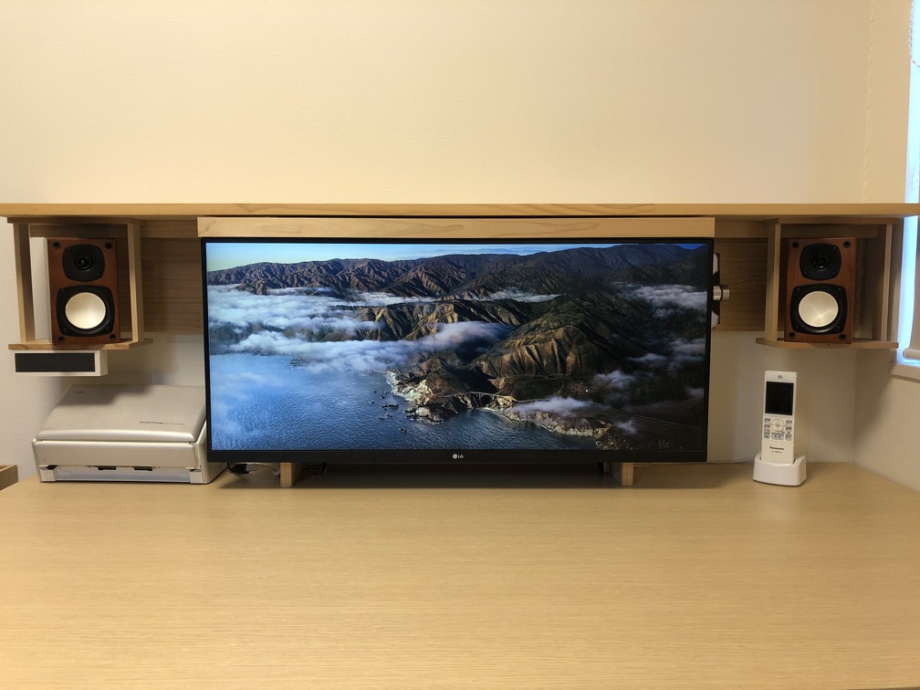 机上棚を作ることで、ディスプレイを壁掛けにしたり、スピーカーを宙に浮かせたりとデスクを自由自在にカスタマイズできるようになりました。