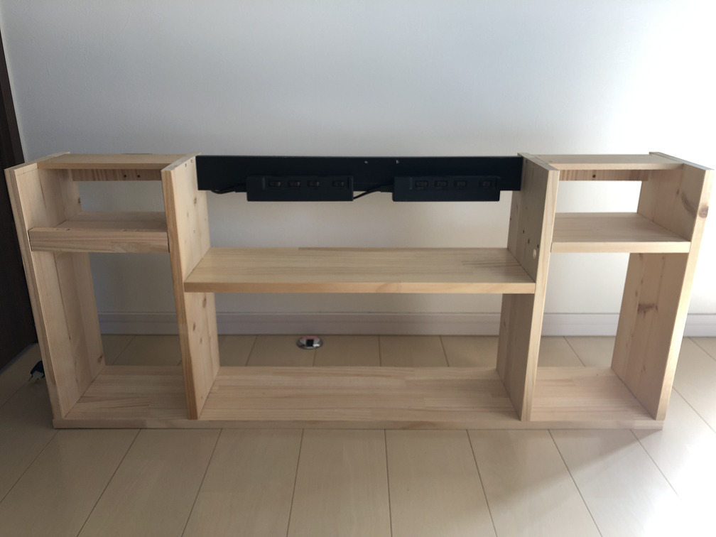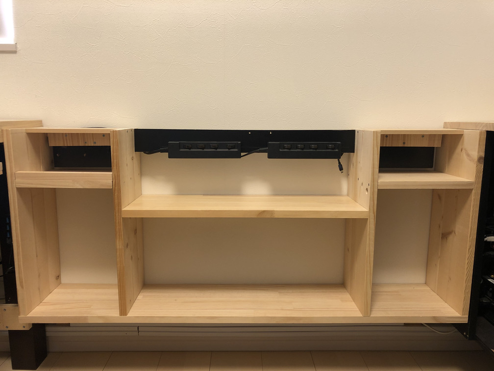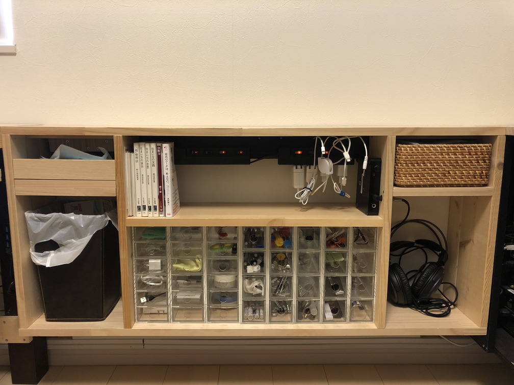 棚の中央上段の電源タップがあるところは、まだ物の定位置が定まっておらず乱雑ですが、追々決めていきたいと思います。