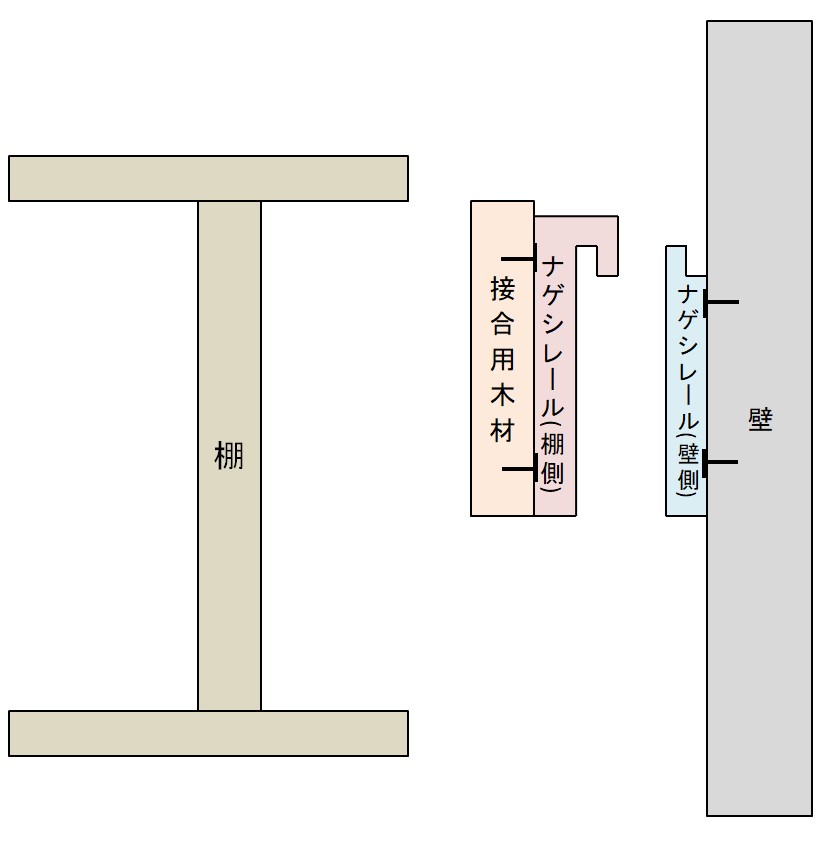そのナゲシレールブラケット(壁側)に、ナゲシレールブラケット(棚側)をつけた接合用木材をひっかけます。