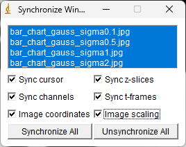 • メニュー「Analyze」「Tools」「Synchronize Windows」で、Syncrhonize Windowsダイアログを開き、「Synchronize All」をクリック & 「Image Scaling」にチェックを入れる